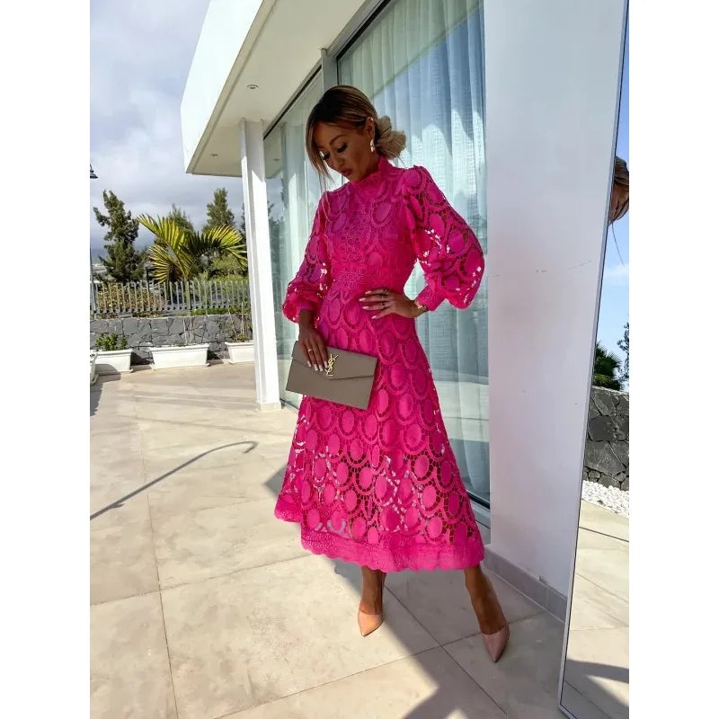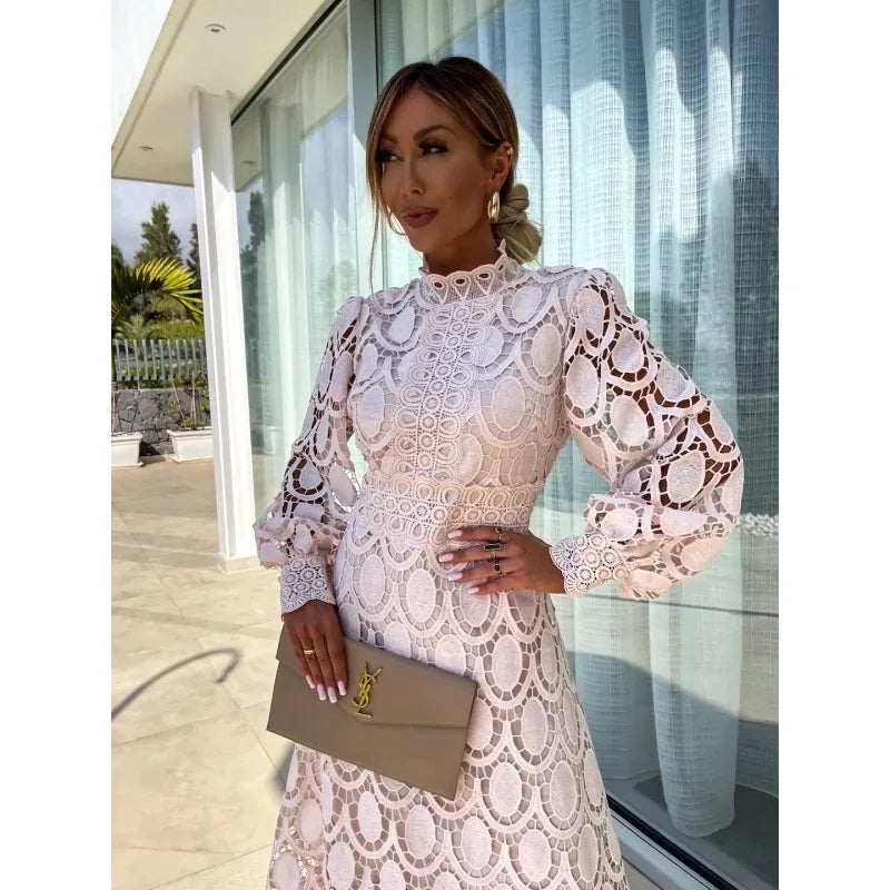 Lucia - Abito A-Line con Collo Alto in Pizzo e Maniche a Sbuffo