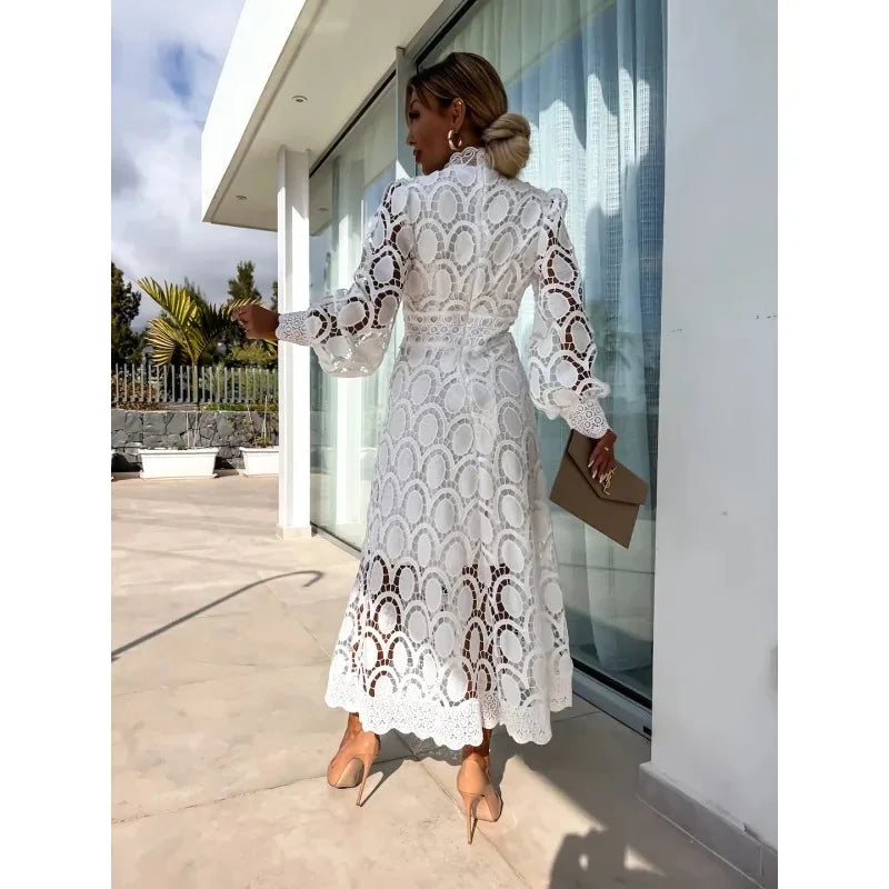 L'abito Lucia è un inno all'eleganza romantica e discreta. Questo nuovo arrivo della collezione Beyonders si distingue per il suo pregiato collo alto rifinito in pizzo e le iconiche maniche a sbuffo che donano un tocco di regalità moderna. Il design con vita stile impero (Empire Waist) è studiato per snellire visivamente la figura, aprendosi poi in una sofisticata silhouette a trapezio che arriva a metà polpaccio.