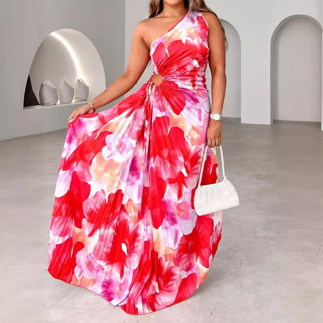 Serena - Abito Maxi Asimmetrico con Stampa Floreale e Spalle Scoperte
